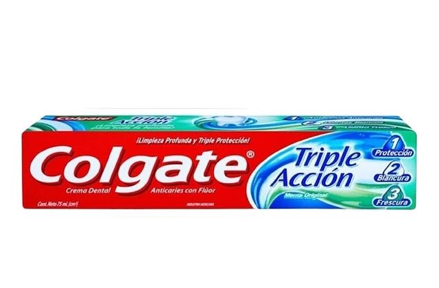 La pasta dental Colgate Triple Acción está formulada para proporcionar una limpieza eficaz y proteger los dientes. Combina propiedades que ayudan a combatir las caries, refrescar el aliento y fortalecer el esmalte dental.
